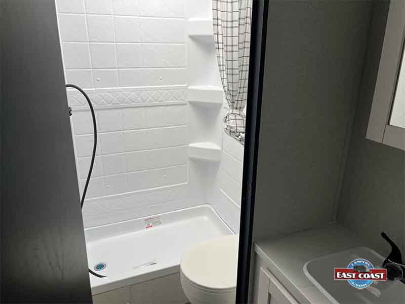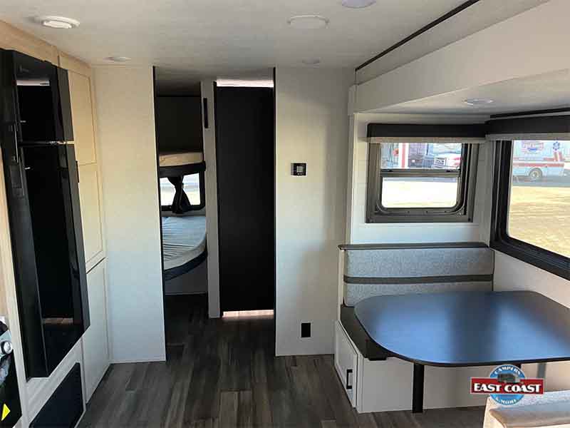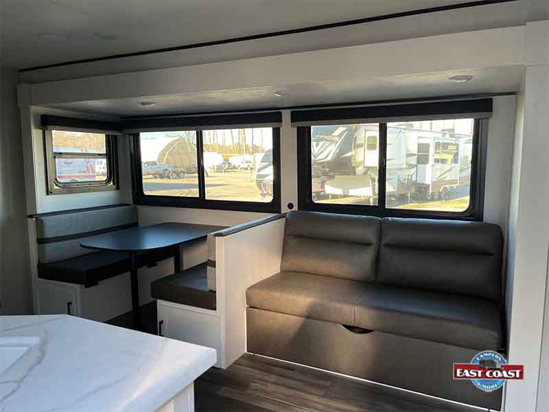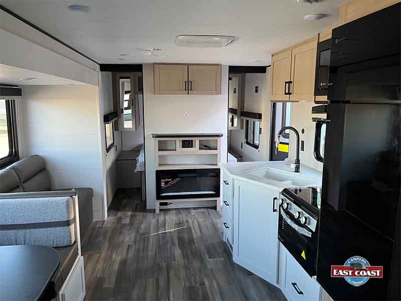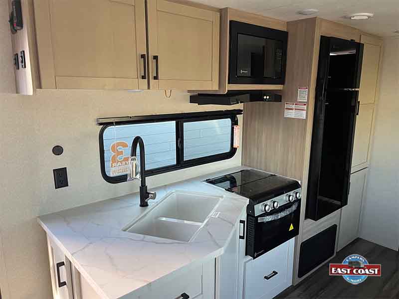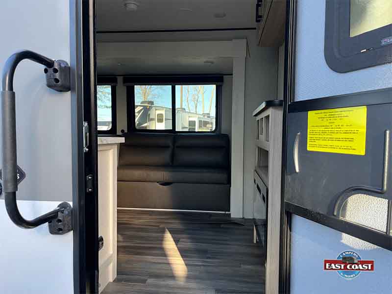 Inside, you’ll find a bright, open living area that expands thanks to a slide-out, creating a welcoming space to relax, dine, or entertain. The kitchen is positioned for efficiency and convenience, offering generous counter space, modern appliances, and plenty of storage to keep everything organized on the road.