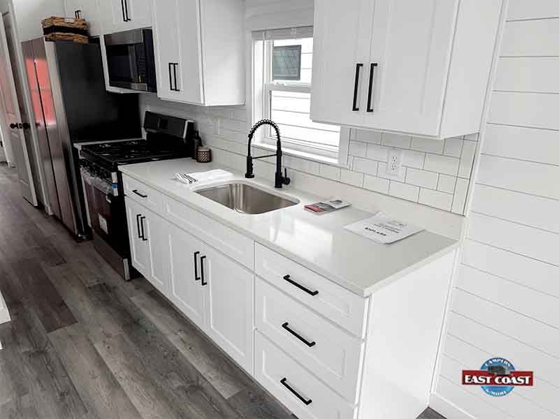 - Soft-closed cabinets, an undermount sink, and gooseneck faucets