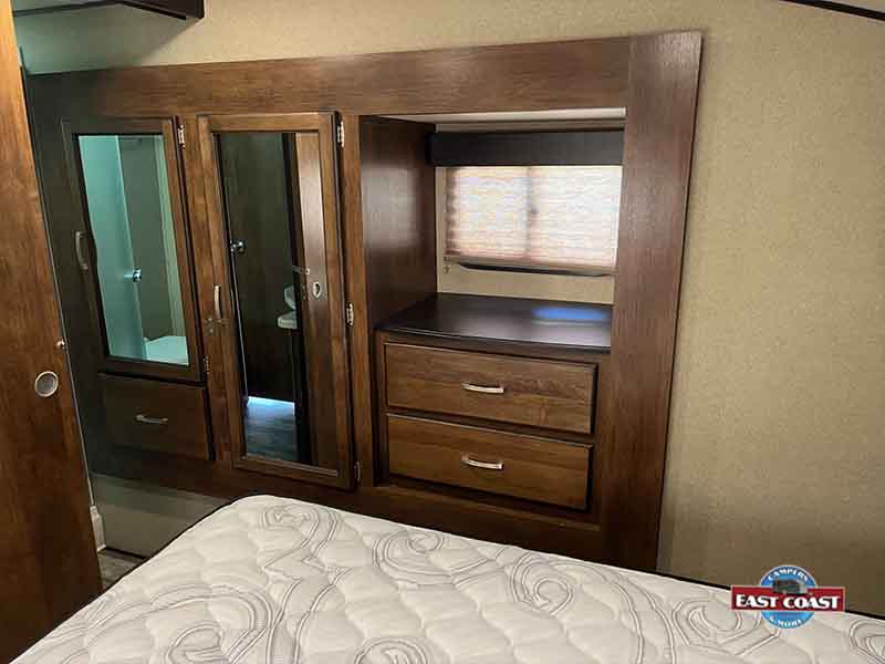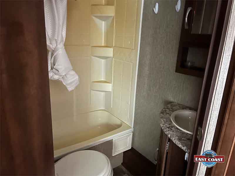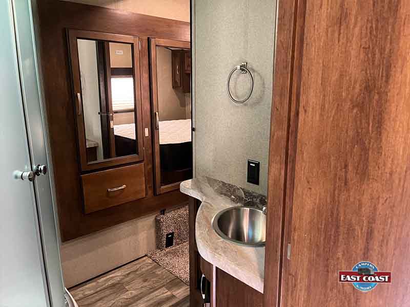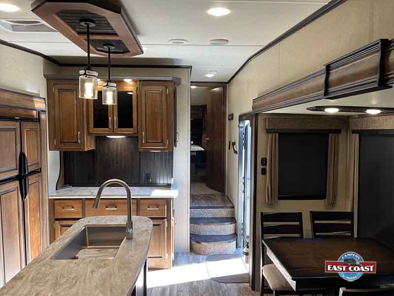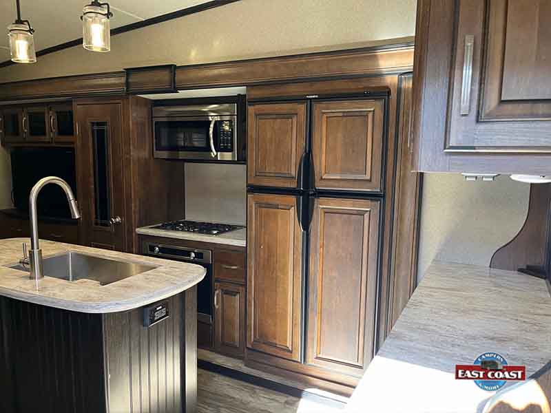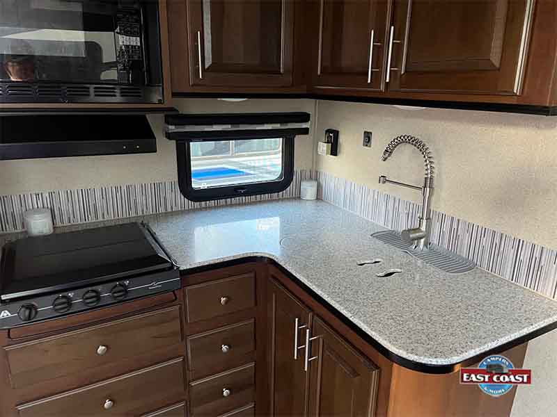 Enjoy a fully equipped kitchen with solid-surface countertops, stainless sink, and generous storage. The master suite up front offers privacy and comfort, while the outdoor kitchen and power awning make campsite living easy and fun.
