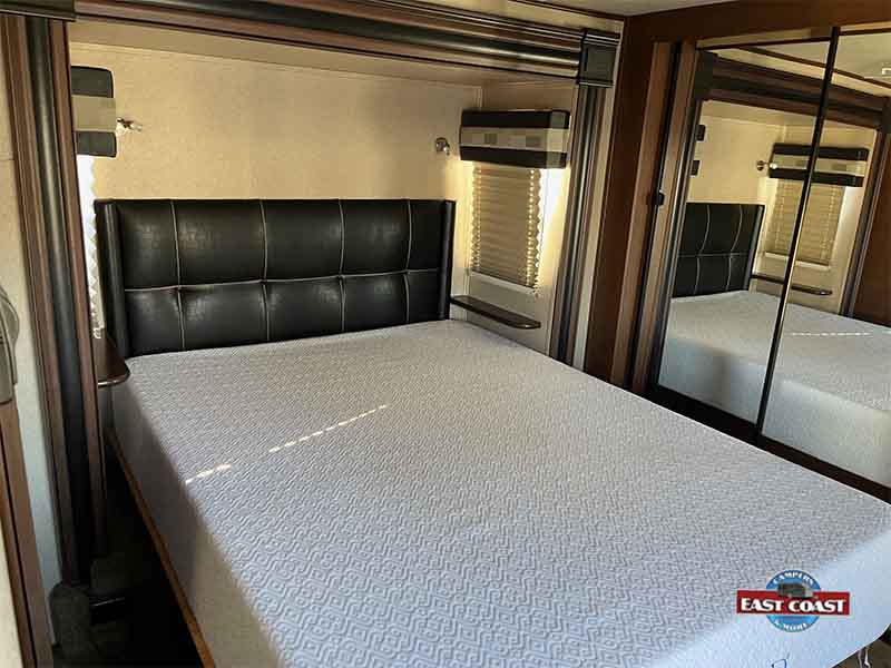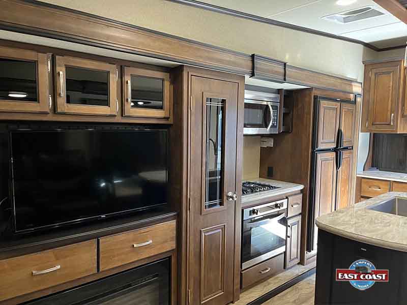 In the heart of the RV, the open living area includes cozy seating options, an entertainment center with a large LED TV and fireplace, and a well-equipped kitchen featuring a roomy island, generous storage, and a residential-style refrigerator. The master suite offers a peaceful retreat with a queen bed and direct access to a full bath.